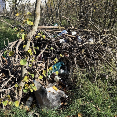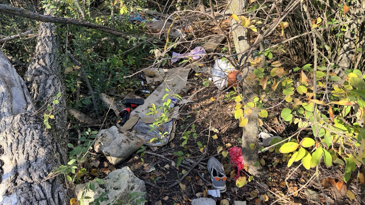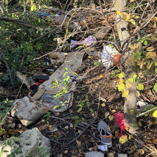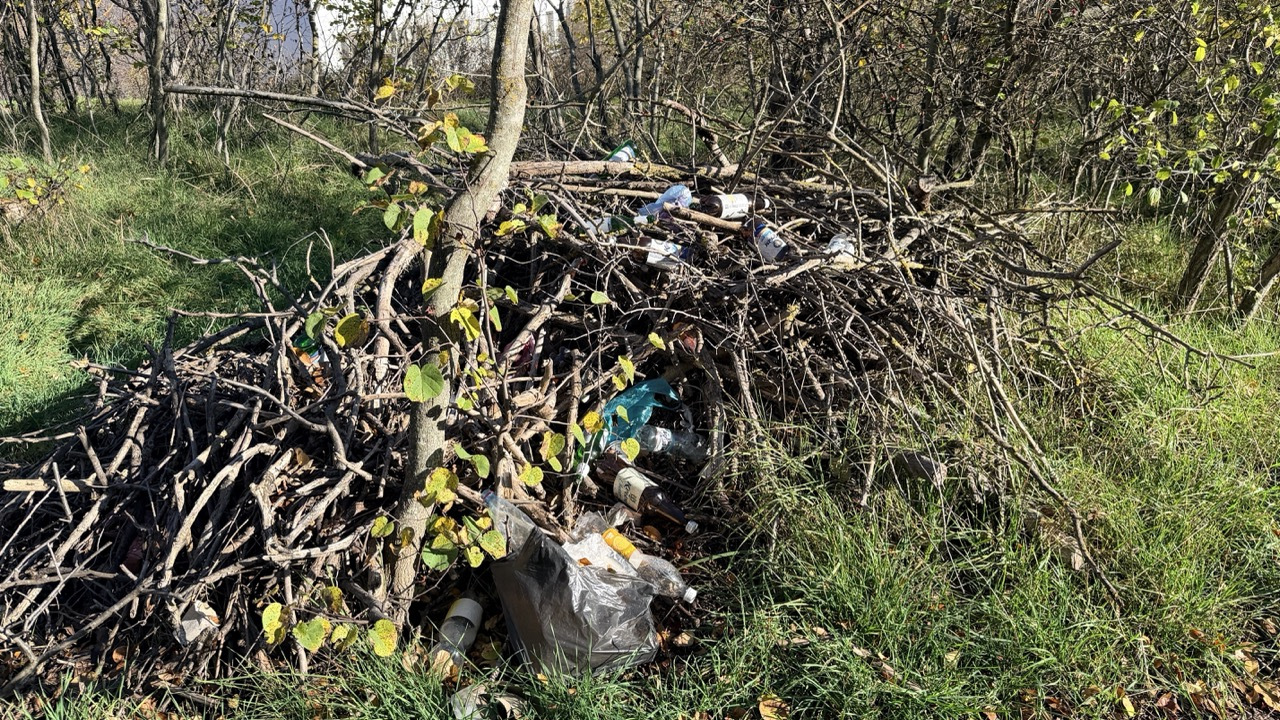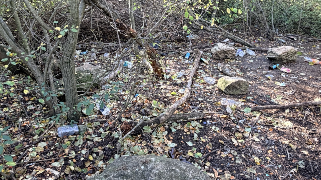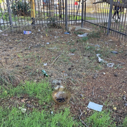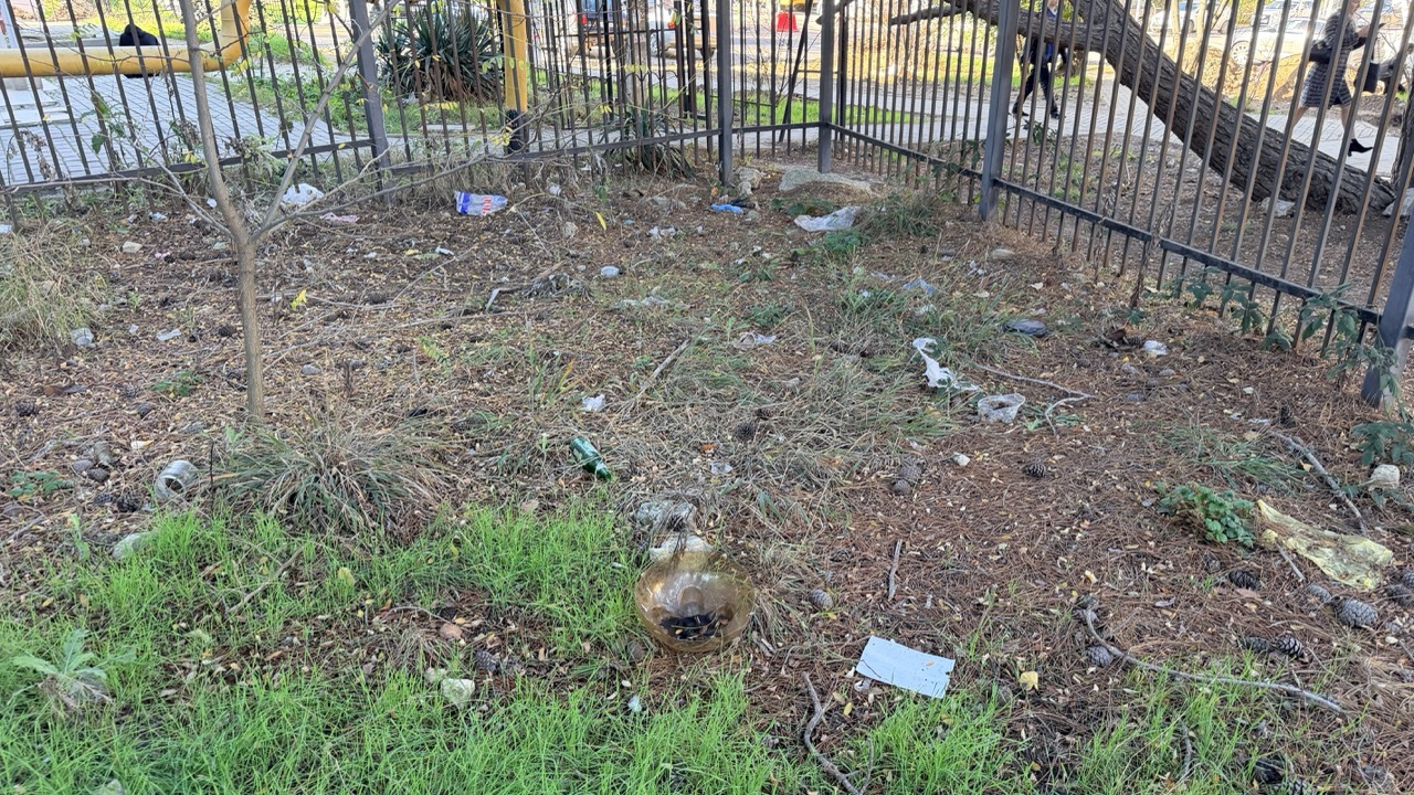 Много мусора в районе входа в комплекс и много мелкого мусора в зеленой зоне.