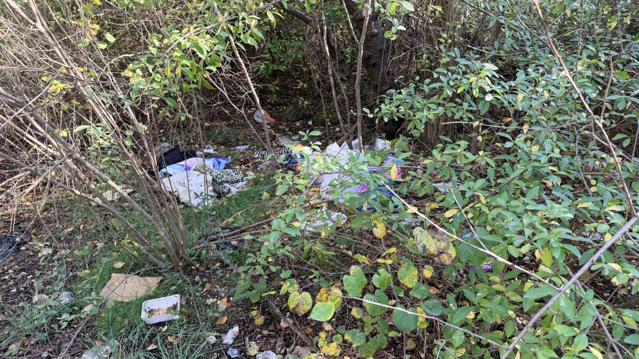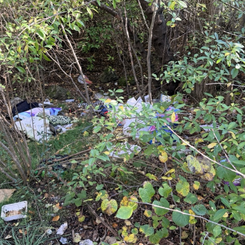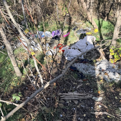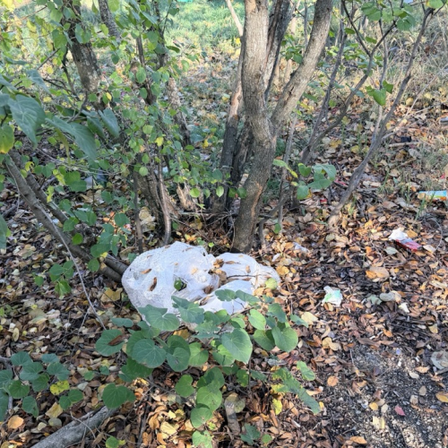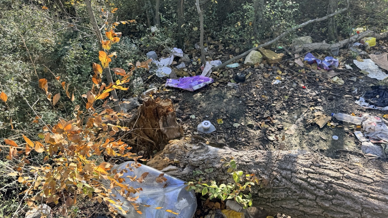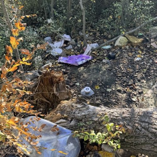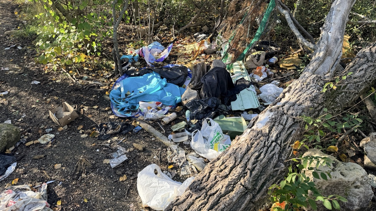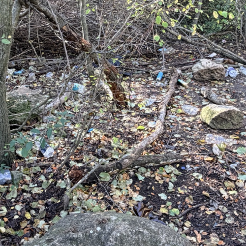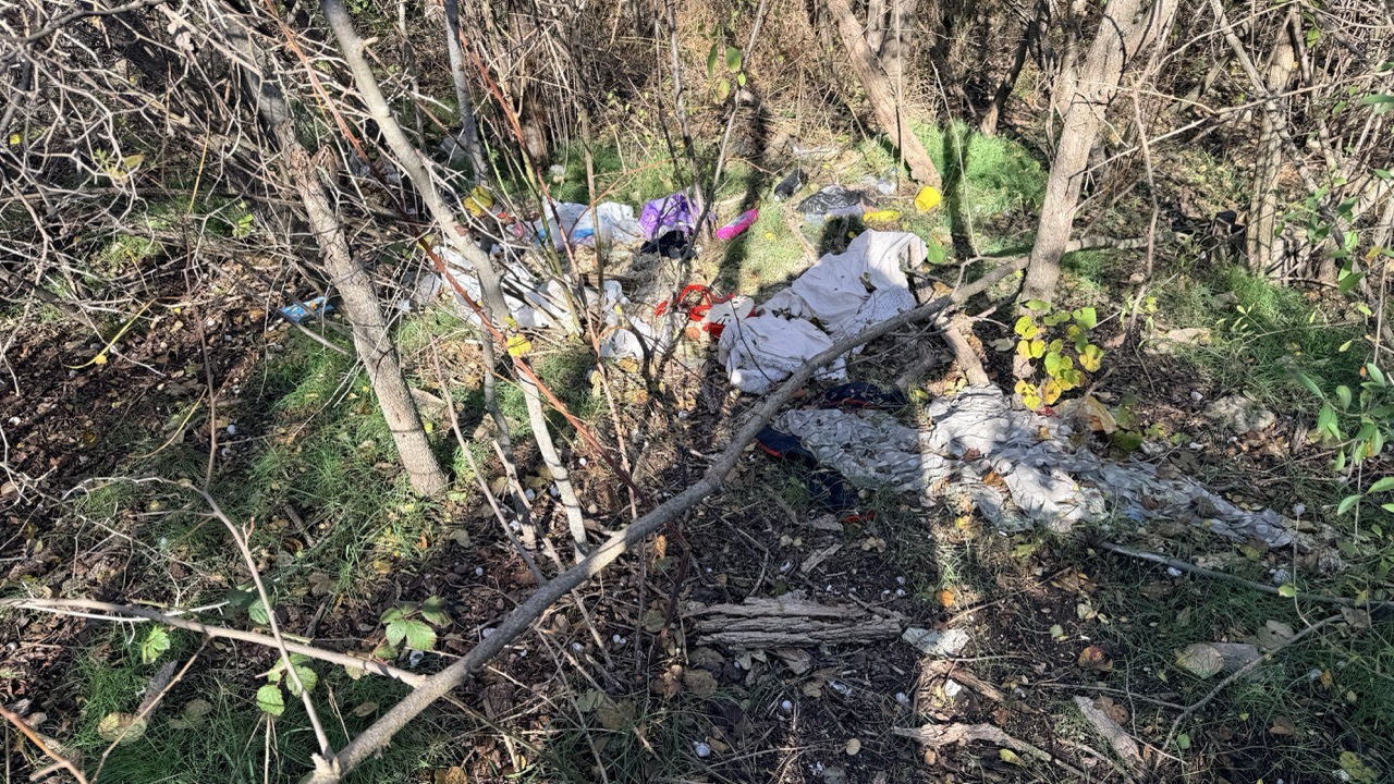 Много мусора в районе входа в комплекс и много мелкого мусора в зеленой зоне.