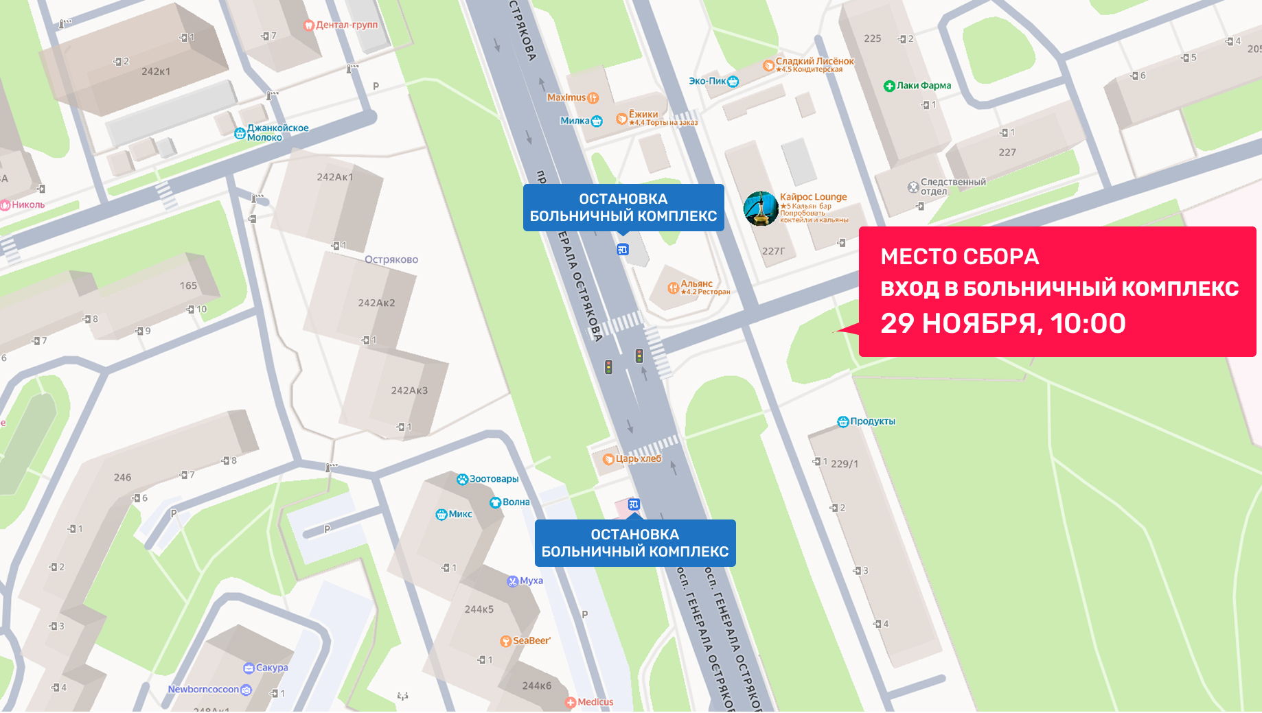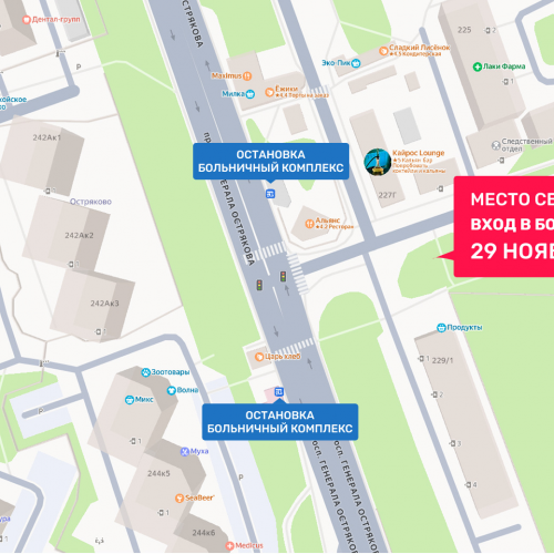 Где: Вход в Больничный комплекст (Пр-кт Ген. Острякова).